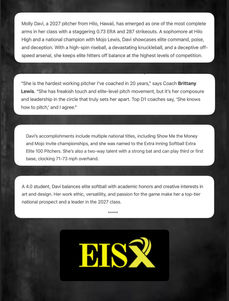 Molly Davi, a 2027 pitcher from Hilo, Hawaii, has emerged as one of the most complete arms in her class with a staggering 0.73 ERA and 287 strikeouts. A sophomore at Hilo High and a national champion with Mojo Lewis, Davi showcases elite command, poise, and deception. With a high-spin riseball, a devastating knuckleball, and a deceptive off-speed arsenal, she keeps elite hitters off balance at the highest levels of competition.